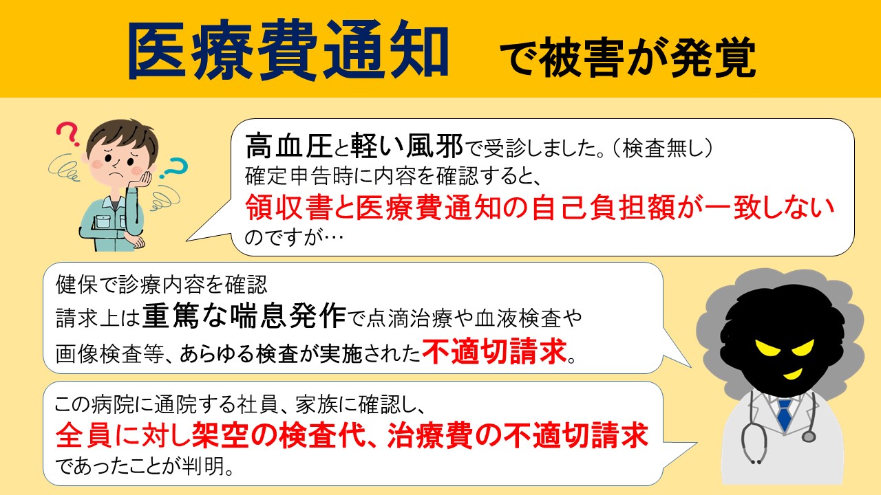 調査の結果 : 健保組合が詳細な診療内容を確認したところ、患者ご本人からは適切な医療費が徴収されていた。しかし、健保組合への請求には、実際には実施されていない架空の検査代や治療費 が含まれていました。
